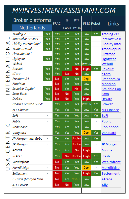 Vous avez maintenant une vue d'ensemble des instituts financiers qui acceptent des clients dans votre pays. Votre premier filtre consiste à identifier ceux qui répondent « oui » aux quatre premiers critères. L'investissement robotisé peut être intéressant mais n'est pas forcément un critère de sélection essentiel pour les investisseurs autonomes. Dans le cas de «Netherlands », vous pouvez voir qu'il y a 7 sociétés avec 4 « feux verts » tandis que les autres ne cochent pas toutes les cases. Il s'agit d'un choix important par rapport à d'autres pays. Vérifiez !