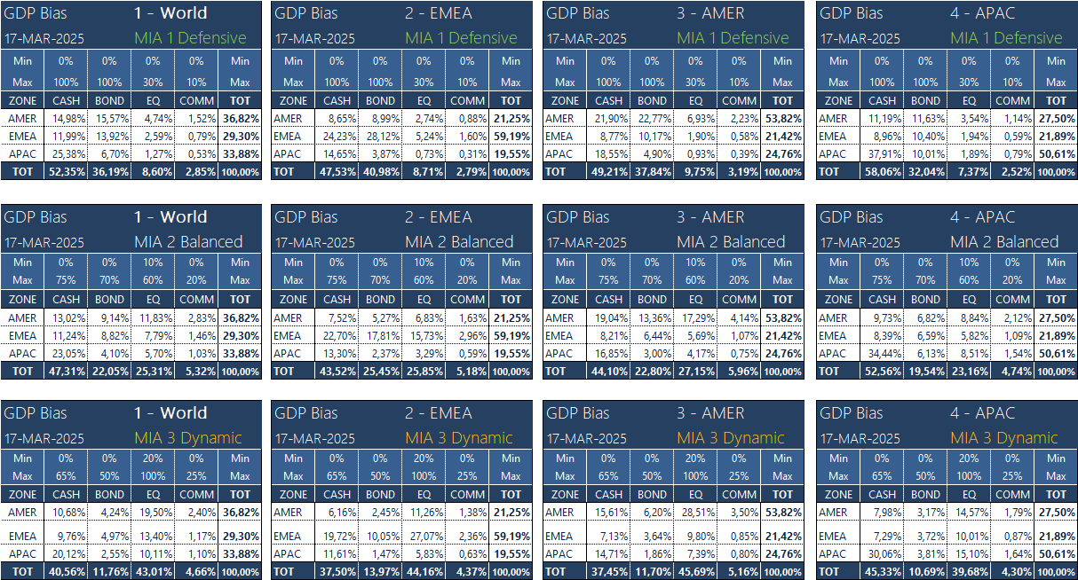 Au cas où vous gérez un portefeuille véritablement mondial, il suffit de sélectionner « World » ce qui attribue à chacun des 40 pays suivis le poids réel de leur PIB. Le résultat de cette approche nous donne 12 « boîtes », 1 ligne (4 zones géographiques) pour les profils défensifs, 1 ligne (4 zones géographiques) pour les profils d'équilibre et 1 ligne (4 zones géographiques) pour les profils dynamiques. Vous pouvez les consulter sous le bouton de menu « Allocation d'actifs ».